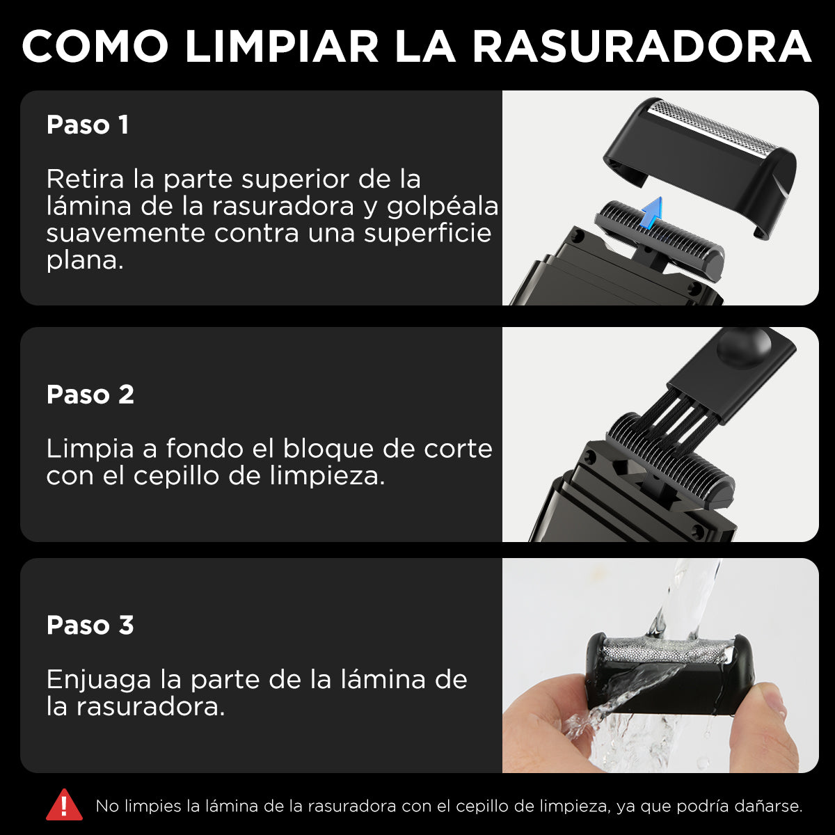El cabezal de la cuchilla es desmontable, facilita el lavado y la limpieza, viene con un cepillo de limpieza de la afeitadora para eliminar fácilmente los residuos del afeitado. El diseño de la cubierta de una pieza protege el cabezal de afeitado, adecuado para viajar.